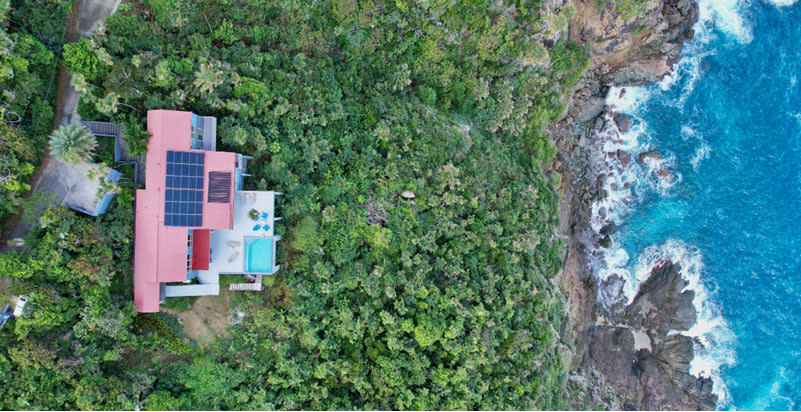 This tropical villa is perched high in the hills of Redrock, a gated community on the Peterborg Peninsula of St. Thomas, USVI. The residence spans 2,500 square feet across three levels, with five bedrooms and three bathrooms. The upper-floor great room has dark wood floors under a white cathedral ceiling, and picture windows to frame the views of sea and sky. The lower level leads out to lush gardens and a beautiful sea-view infinity pool. Green technologies include solar power and an EV-charging station.(Discover this Tropical Villa Here)