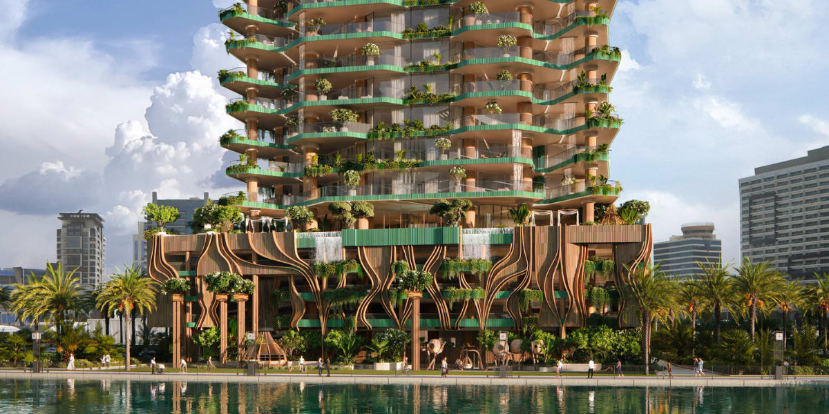True opulence abides in the soaring spaces of this “wild luxury” penthouse in Eywa, a revolutionary, eco-friendly tower overlooking the Dubai Water Canal. Inspired by nature, the building’s design evokes the sheltering banyan tree of life, with open, circular columns emulating the sacred tree’s organic weave of branches and interlacing roots. Its Earth-friendly credentials include LEED Platinum, WELL Platinum, and HealthTechPro certifications. (Discover Eywa Here)